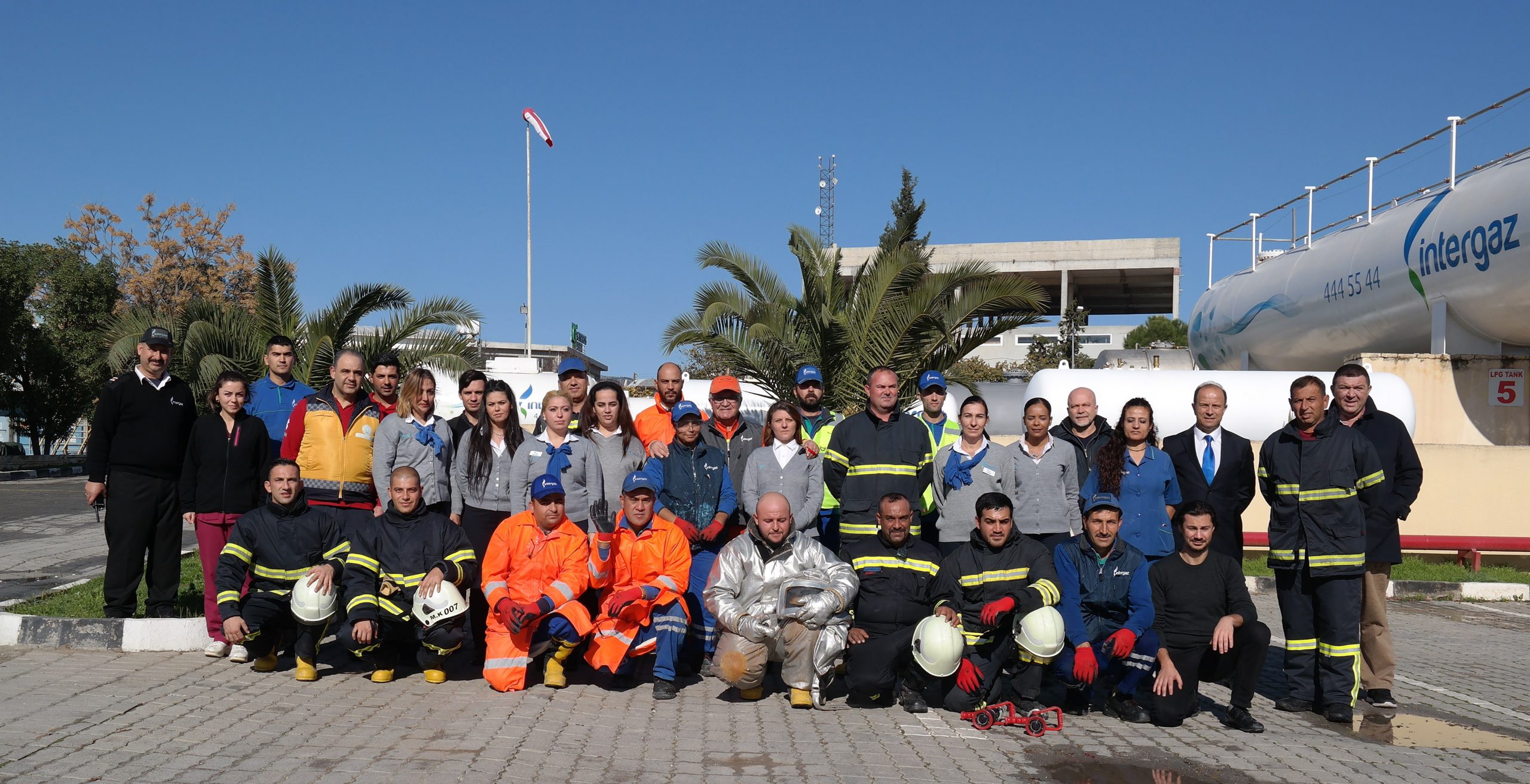 Intergaz tesisinde düzenlenen tatbikat sonrasında Intergaz personeli hatıra fotoğrafı çektirdiler.