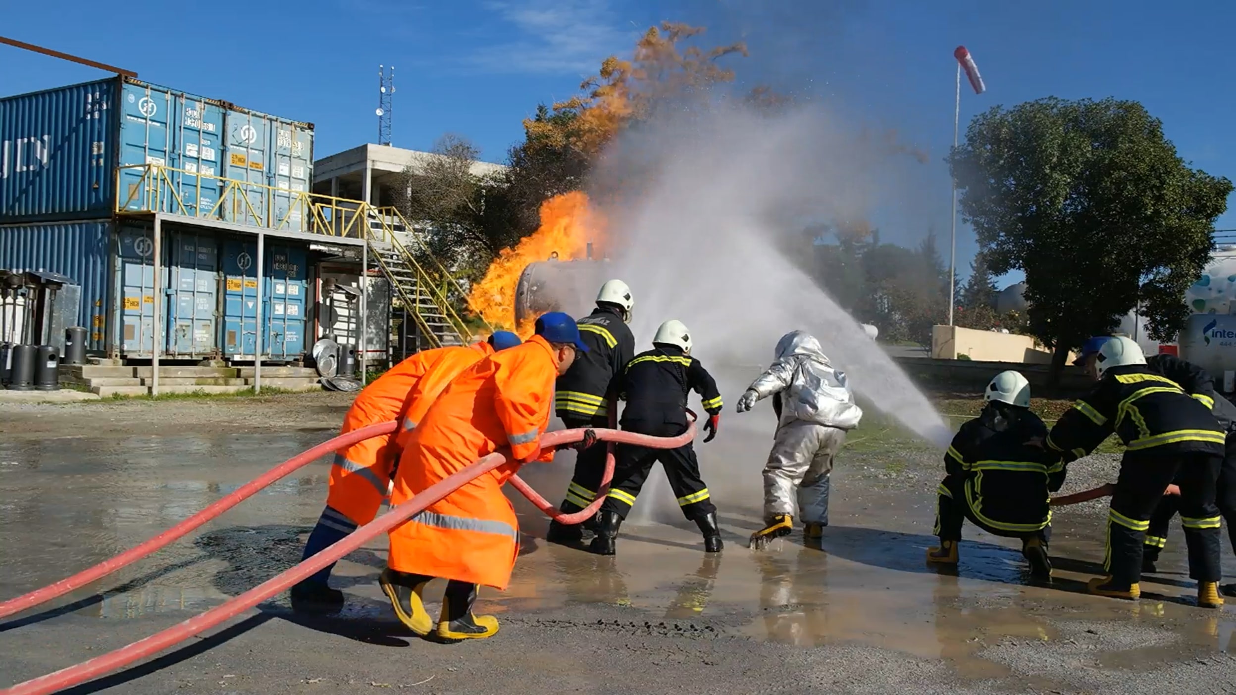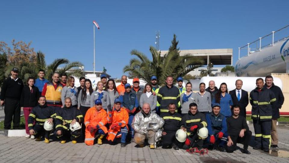 Intergaz tesisinde düzenlenen tatbikat sonrasında Intergaz personeli hatıra fotoğrafı çektirdiler.