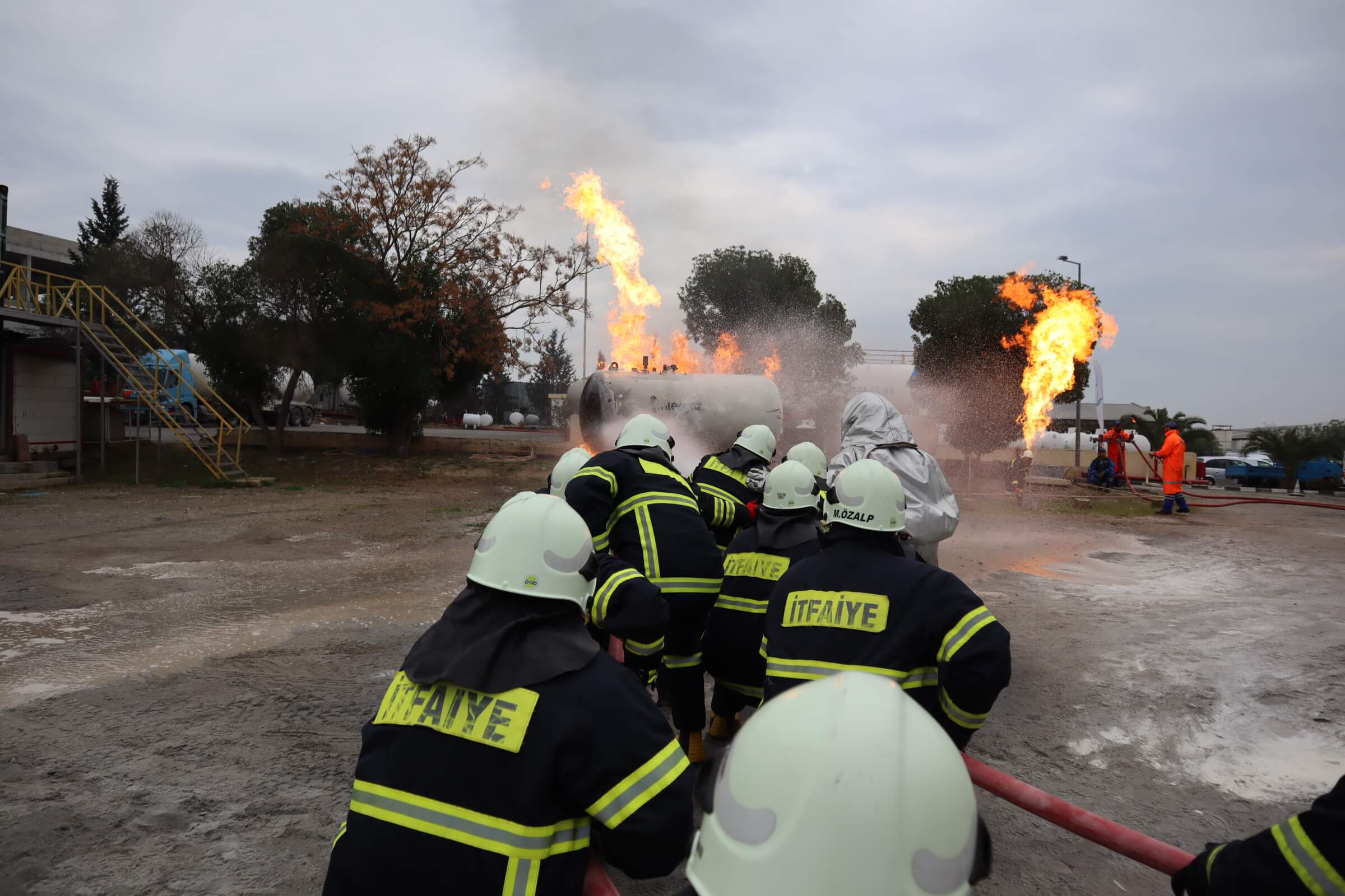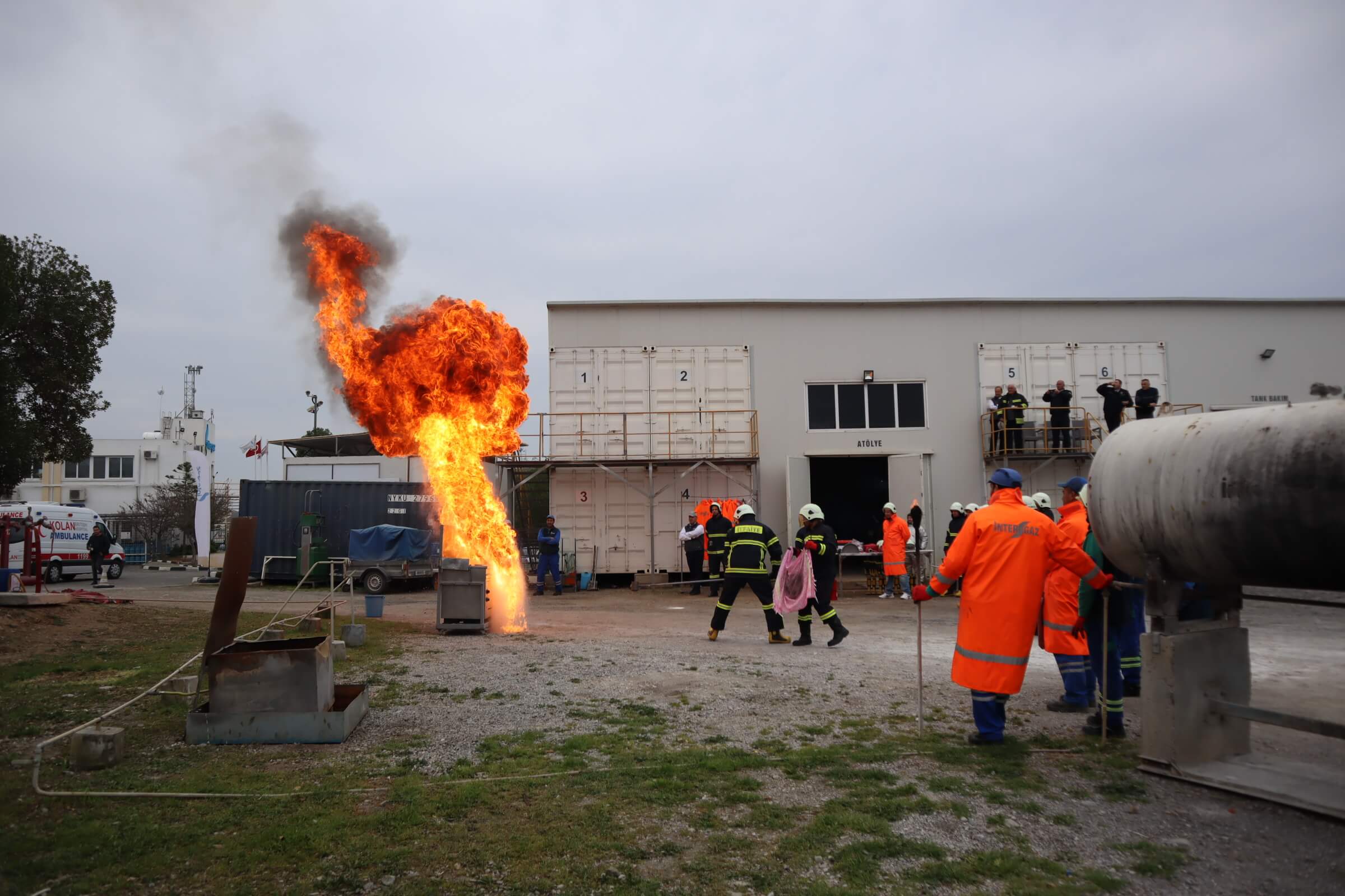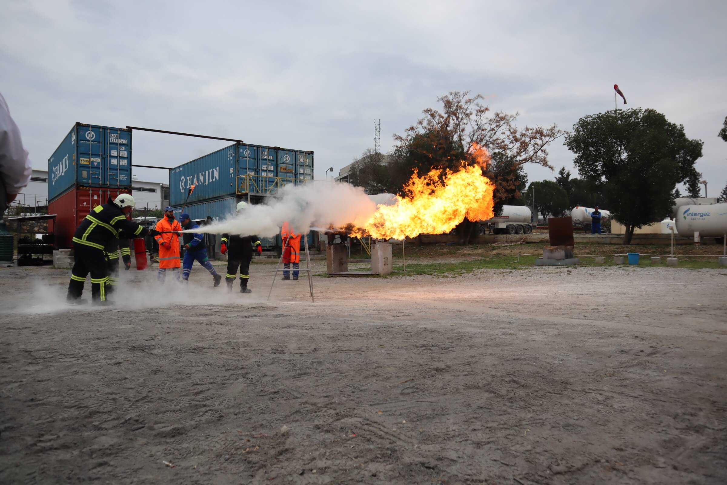 İntergaz tesislerinde düzenlenen yangın söndürme eğitimleri öncesinde katılımcılar tesisi gezdiler ve tesiste alınan güvenlik önlemleri hakkında bil.gi aldılar. Tesisin gezilmesinin ardından LPG tankının söndürülmesiyle ilgili teorik bilgi alan katılımcılar, bilgilerini tatbikatla pekiştirdi. Tatbikatta katılımcılar tek tek yanan LPG tüplerini ve birlikte LPG tankını söndürerek tatbikat yaptı. Yanan LPG tankına müdahale tatbikatı sonrasında mutfak yangınlarına nasıl müdahale edilmesi gerektiğiyle ilgili tatbikat gerçekleştirildi.