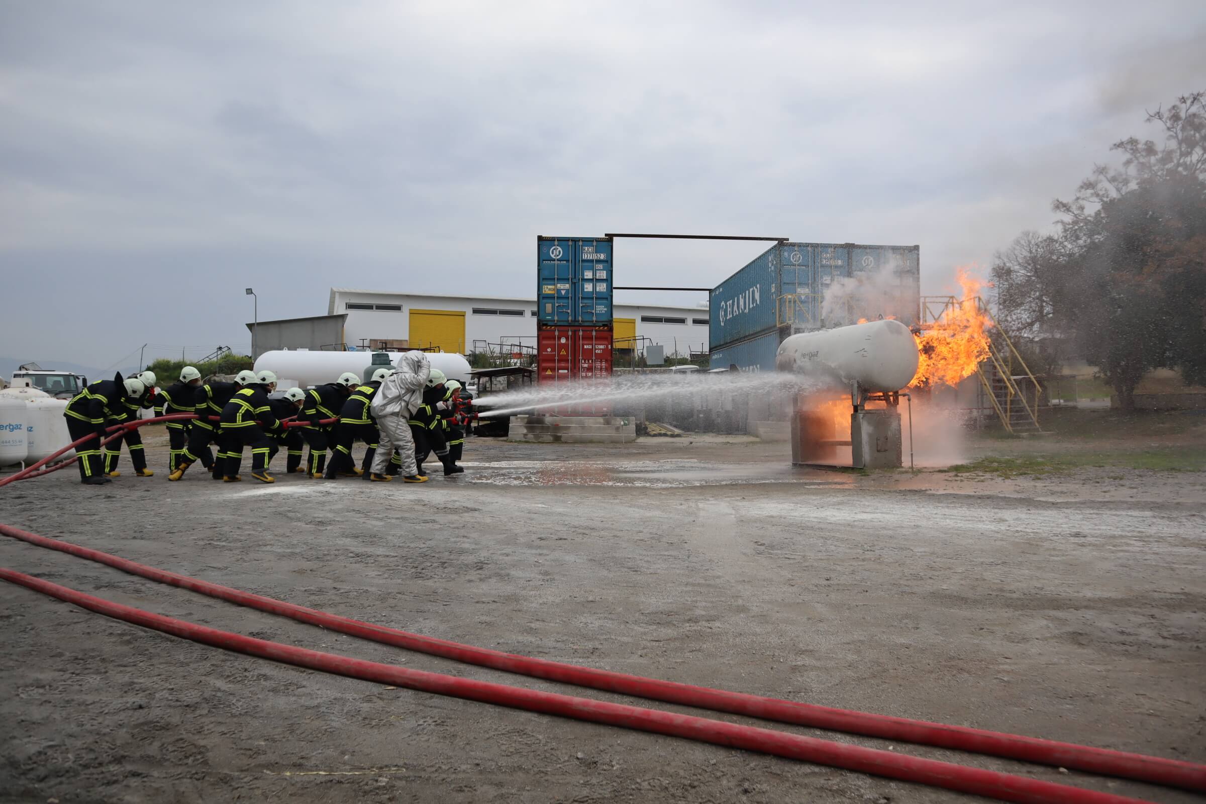 Sanayi Odası’nda yapılan teknik eğitimlerin ardından katılımcılar eğitmenlerle birlikte, İntergaz tatbikat alanında yangınlara müdahaleyle ilgili tatbikat gerçekleştirdi